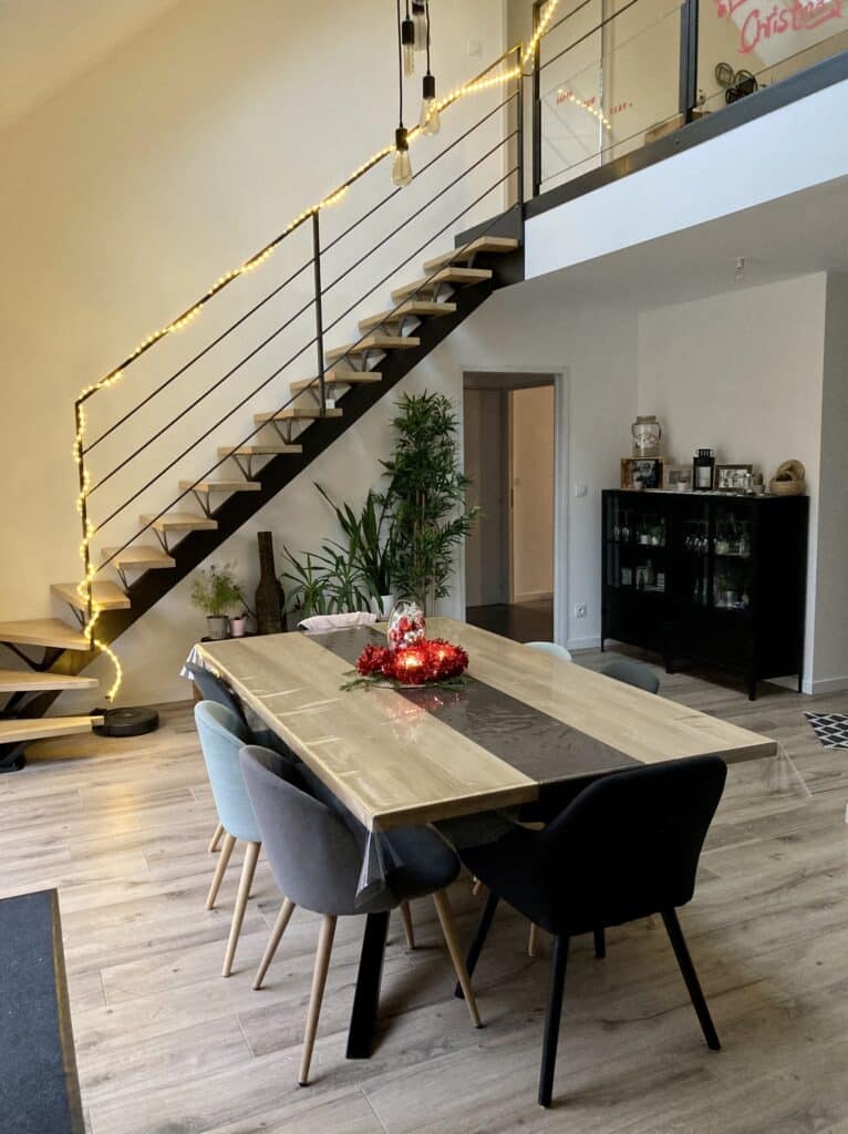 Nous avons réalisé un escalier en hêtre, ¼ tournant par le bas, sur limon central et câbles inox.